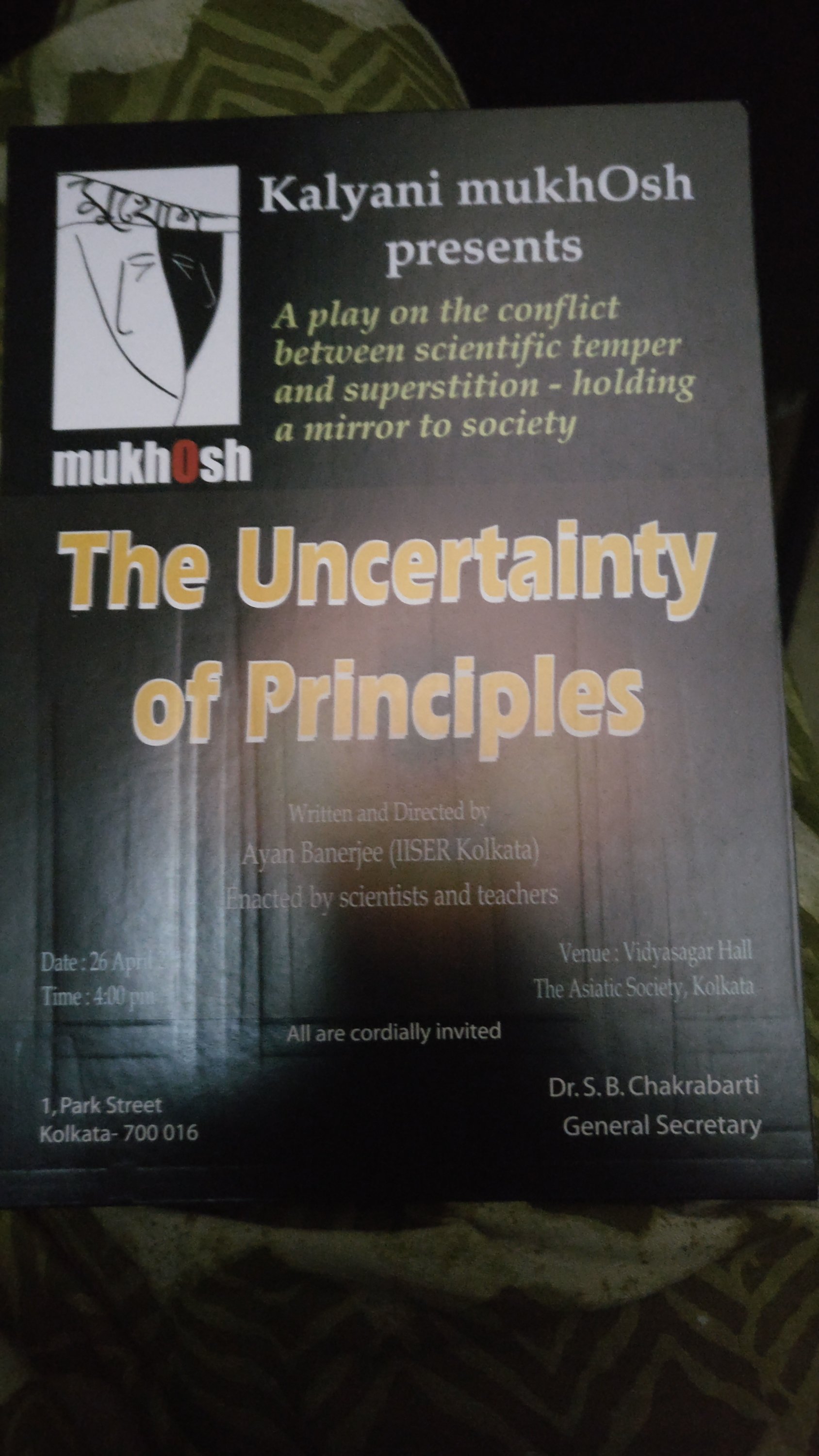 Couple of years ago, I had taken a years break from work. I did many things which I wouldn’t have had liberty to do as a full time working teacher. One of things was – a week long course on History Of Indian Science hosted by Asiatic Society. Icing of the course (cake) was the grand finale – a theatre group called Mukhosh presented an anti-Superstition play – ‘Uncertainty of Principles’ ( ‘https://maddecadence.wordpress.com/2019/04/29/uncertainty-of-principles-a-brilliant-play-on-conflict-between-science-and-superstition/) in the historic auditorium of Asiatic Society. That’s when I first saw scientist duo Dr. Ayan Banerjee and Dr. Anindita Bhadra with their family on stage calling out superstition and astrologers through their brilliant play.